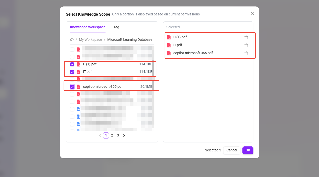 - Click "Knowledge Scope", select multiple documents, and click "Confirm";