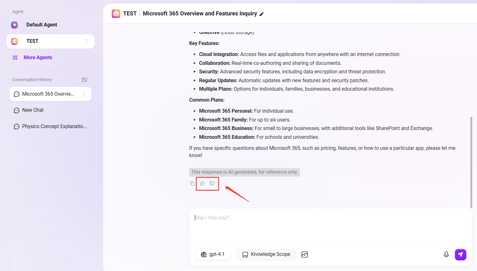 For replies generated by the Agent, users can rate them by upvoting or downvoting.