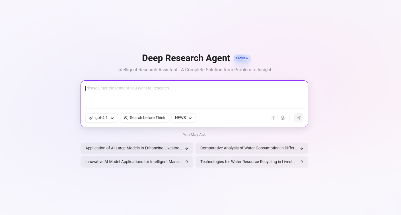 You only need to enter a topic or question you want to research, and the system will automatically retrieve relevant information, analyze the content, and generate a structured insight report.
