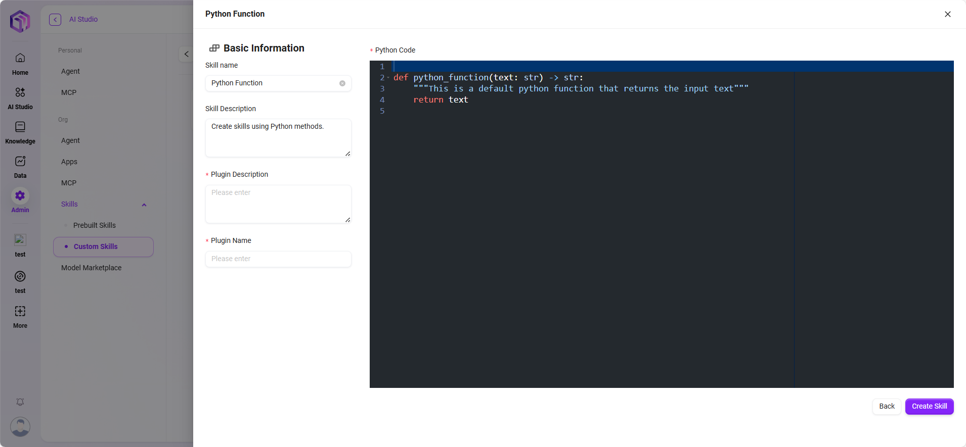 - On the Custom Skills page of Management-AI Studio, click "Create Skill";
