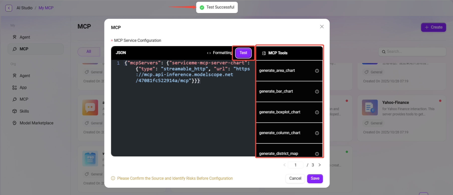 - Click the "Test" button on the MCP configuration page;