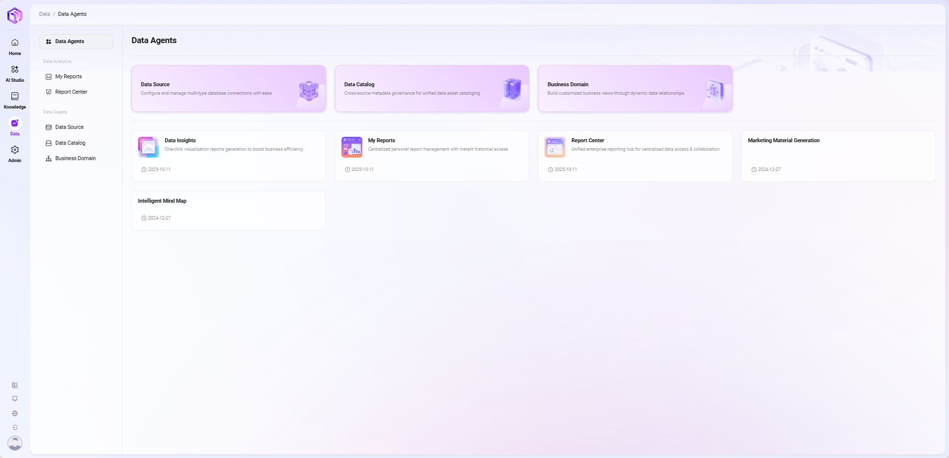 The AI Data module includes several submodules: Intelligent BI, My Reports, Report Center, Data Sources, Data Assets, Business Domains.