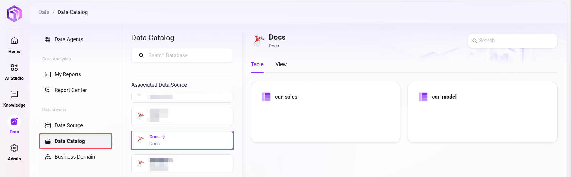 After connecting to a data source, users can view and manage synchronized tables in the "Data Catalog" module.