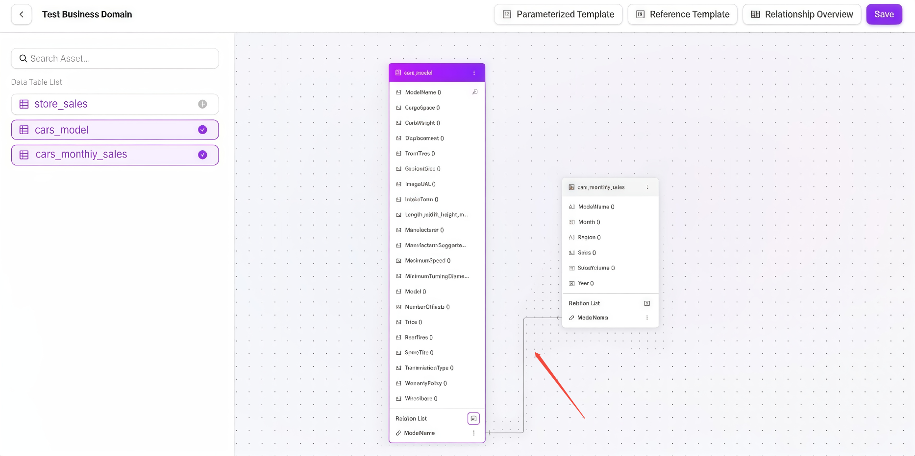 この方法により、ユーザーはビジネスドメイン内で完全なデータ関係ネットワークを構築でき、後続のインテリジェントクエリやチャート生成を容易にします。