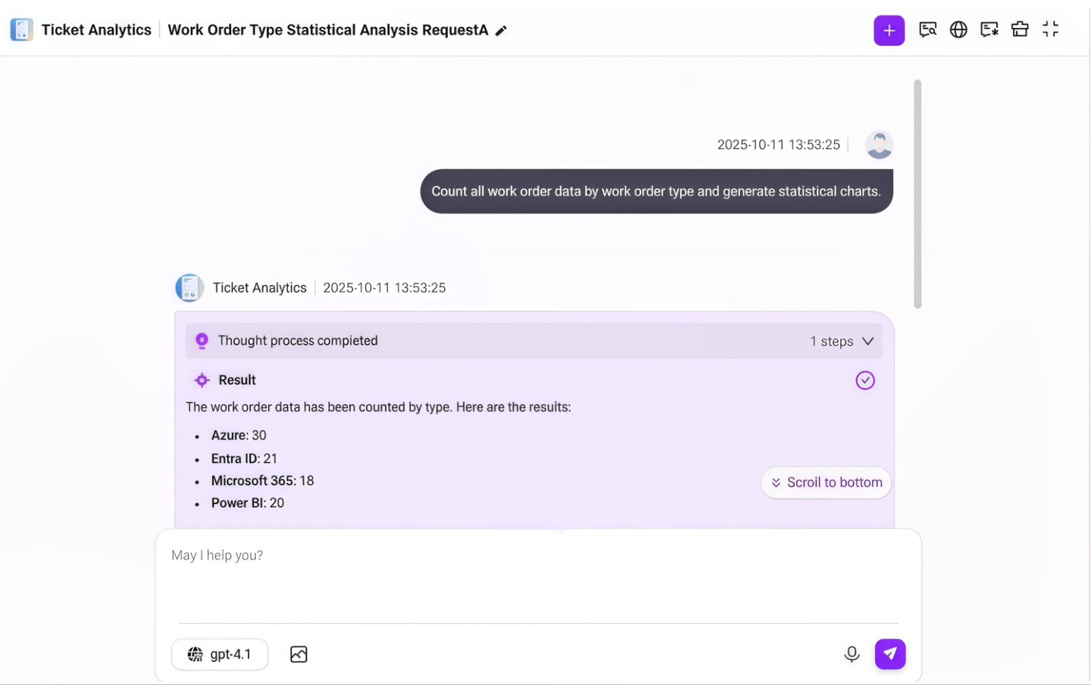- 統計レポート自動生成:チケットタイプ、状態、時間軸などに基づく統計グラフ(棒グラフ、円グラフ、折れ線グラフ)を生成可能;