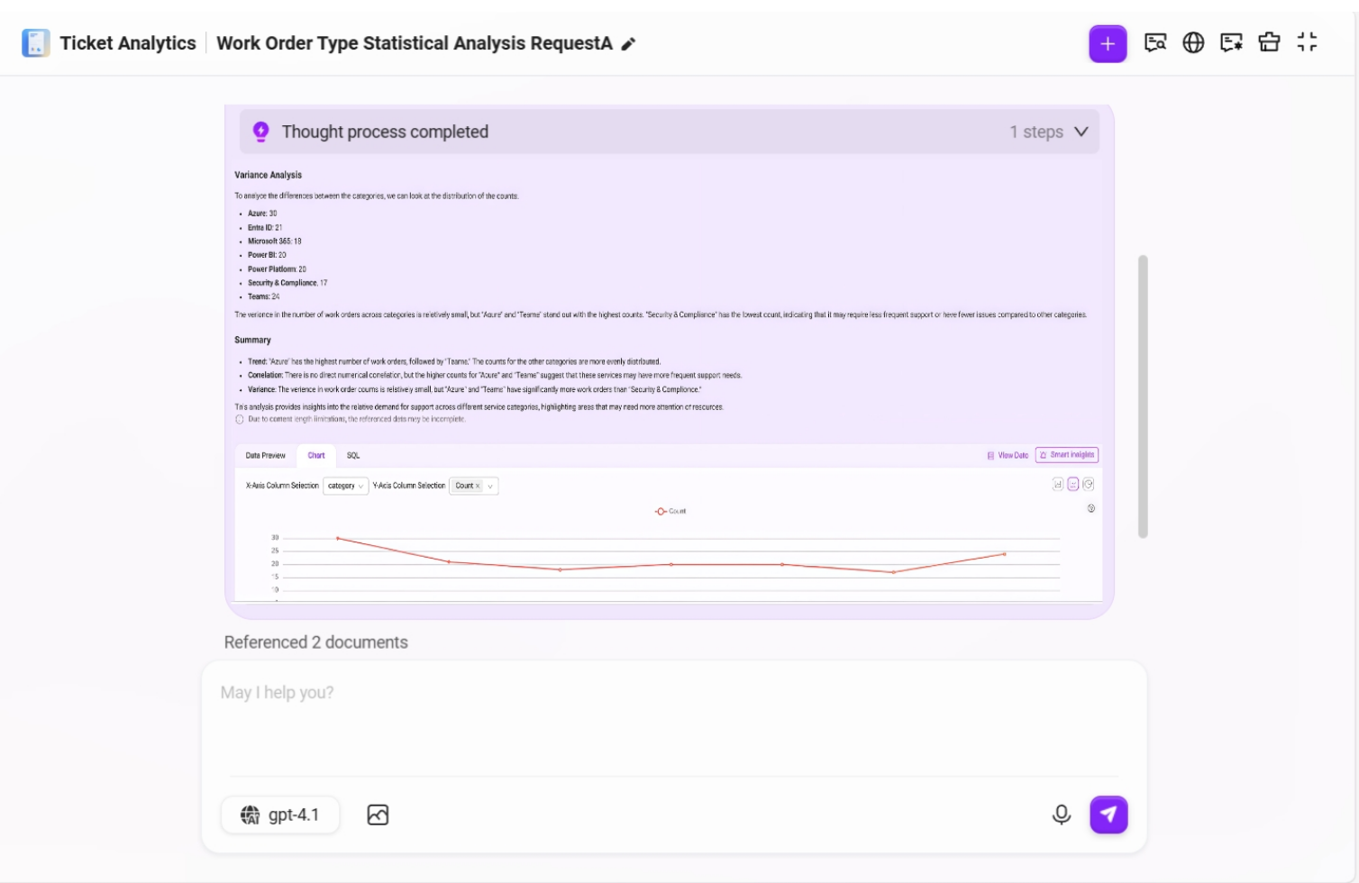 このシナリオでは、データソースに基づくインテリジェントエージェント「Ticket Analytics」を構築し、チケットデータの自動集計、分析、可視化表示を実現し、以下のコア機能を備えています: