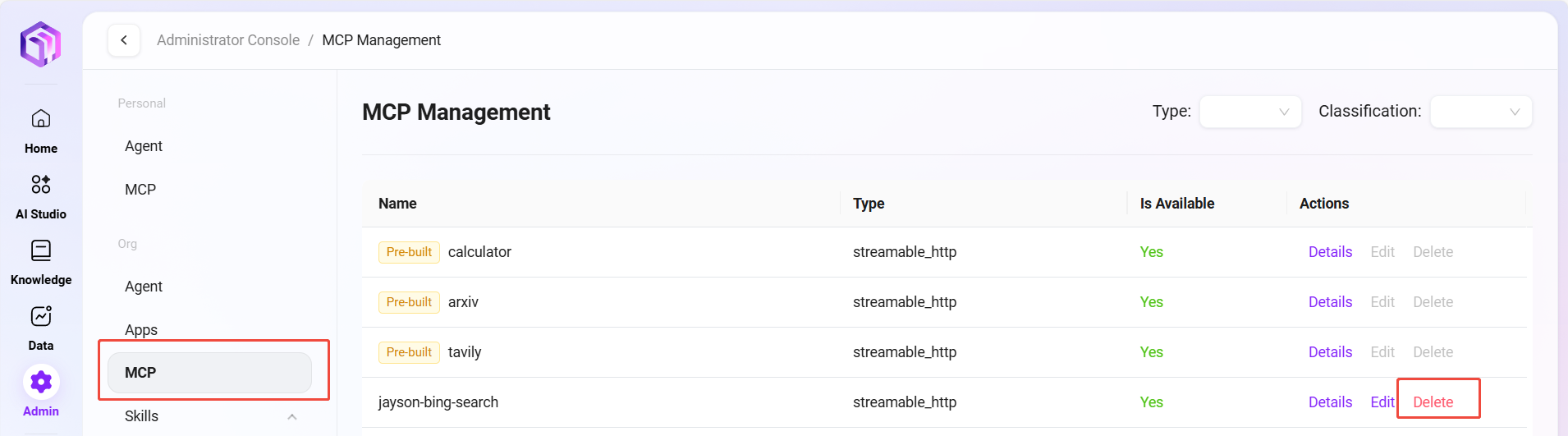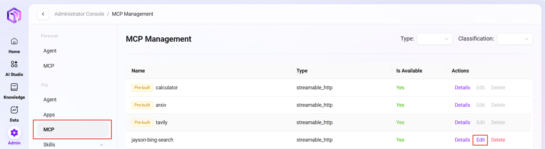 管理者はシステム内で組織レベルのMCPサービスを管理できます。これらのサービスは組織全体に提供される標準化された外部能力拡張です。組織MCP管理を通じて、管理者は組織レベルサービスの安定性と安全性を確保できます。