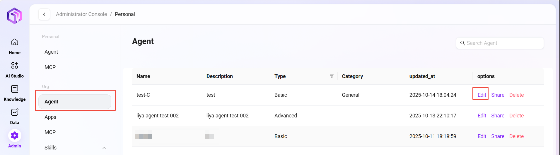 管理者はシステム内で個人エージェントを管理できます。これらのエージェントはユーザーが自身のニーズに応じて作成したAIアシスタントです。エージェント管理を通じて、ユーザーは自分のAIアシスタントリソースを整理、維持、最適化できます。