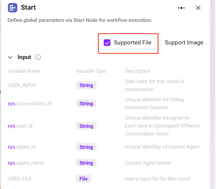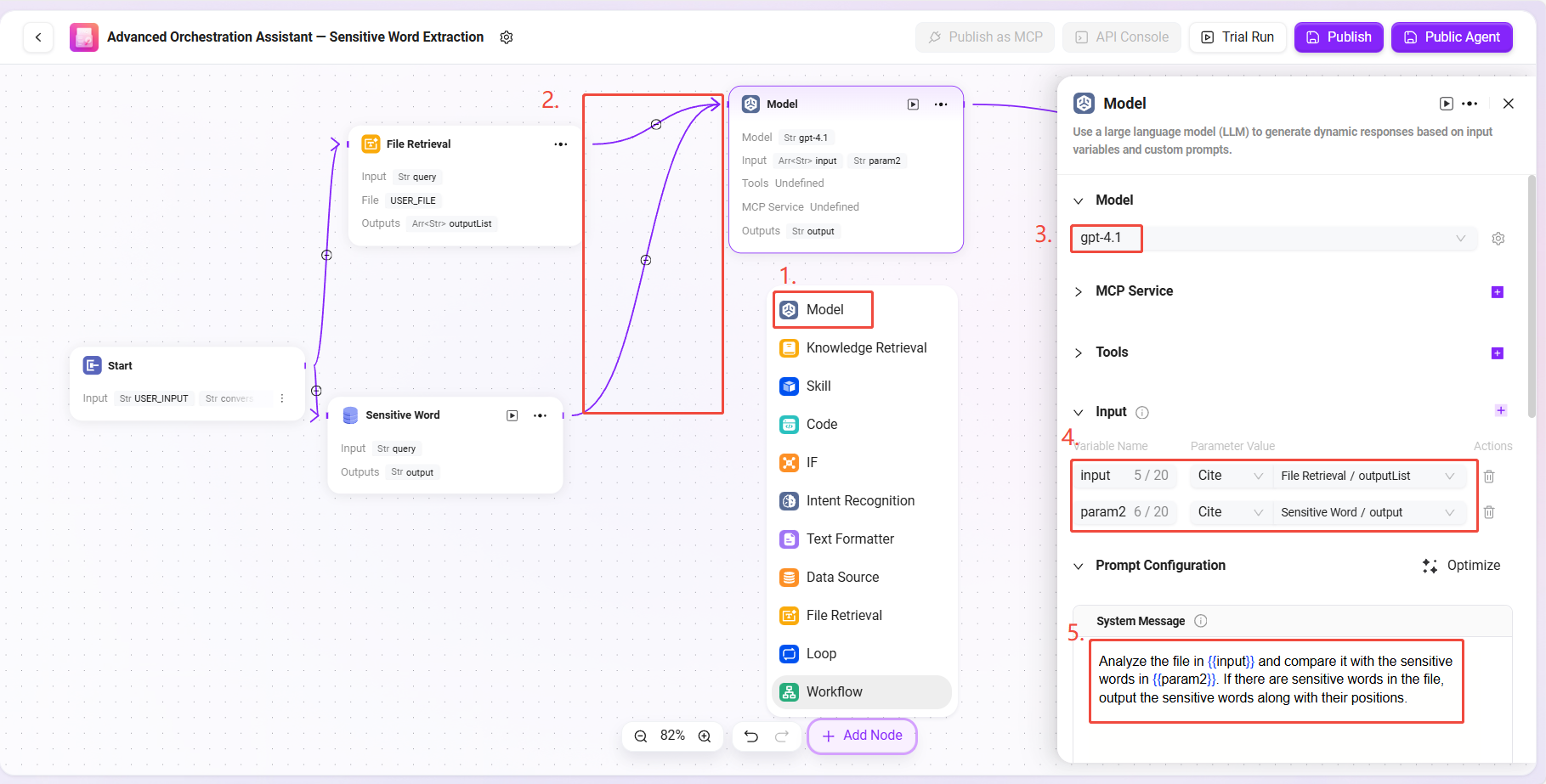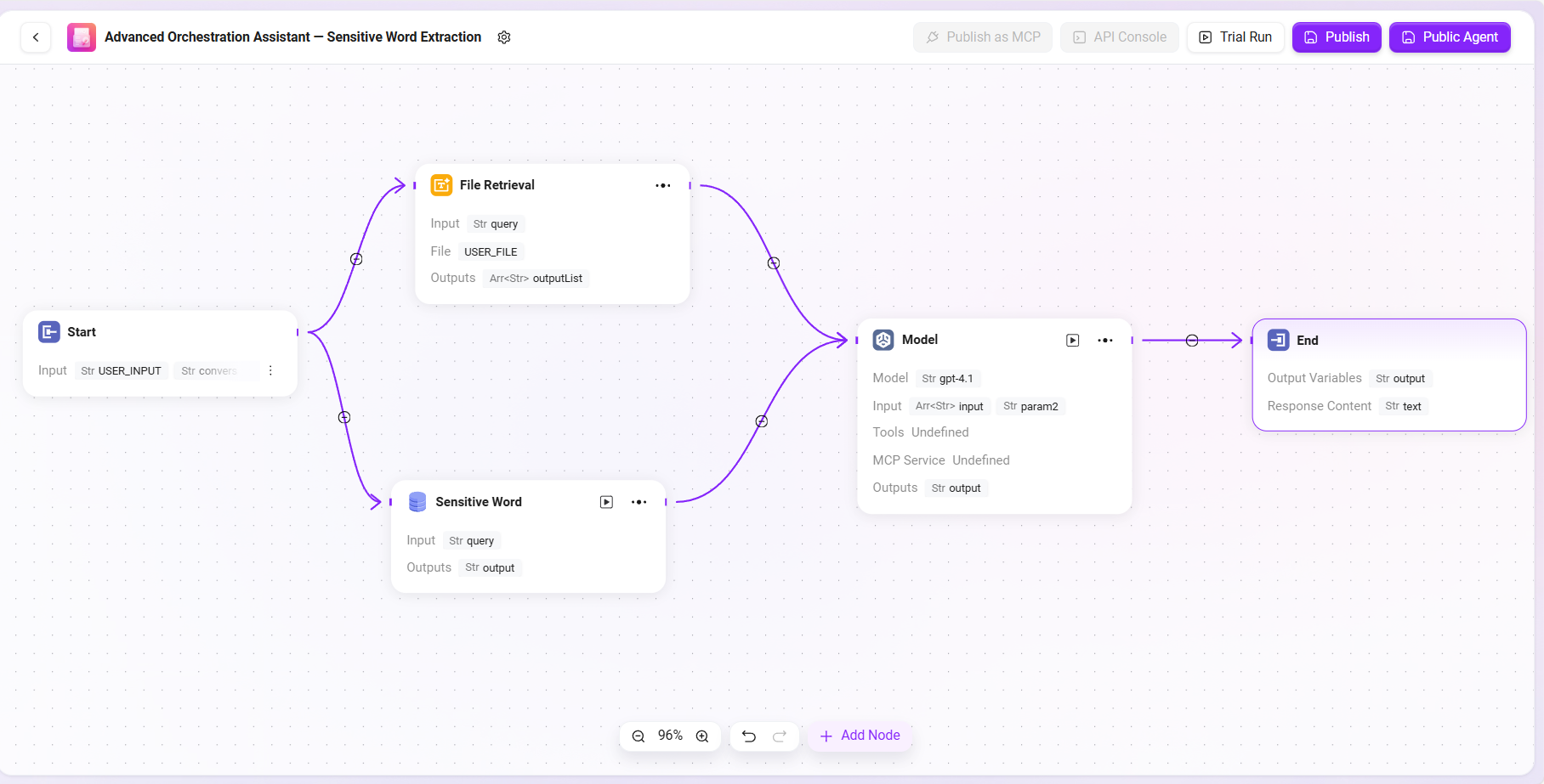 本例のWorkflowでは、各ノードの入出力は前のノードの結果を参照して設定します。センシティブワード抽出の目的を達成するために、本フローは主に開始ノード、ファイル処理ノード、データソースノード、モデルノード、終了ノードの各ノードを含みます。以下に各ノードの設定と接続方法を順に説明します。