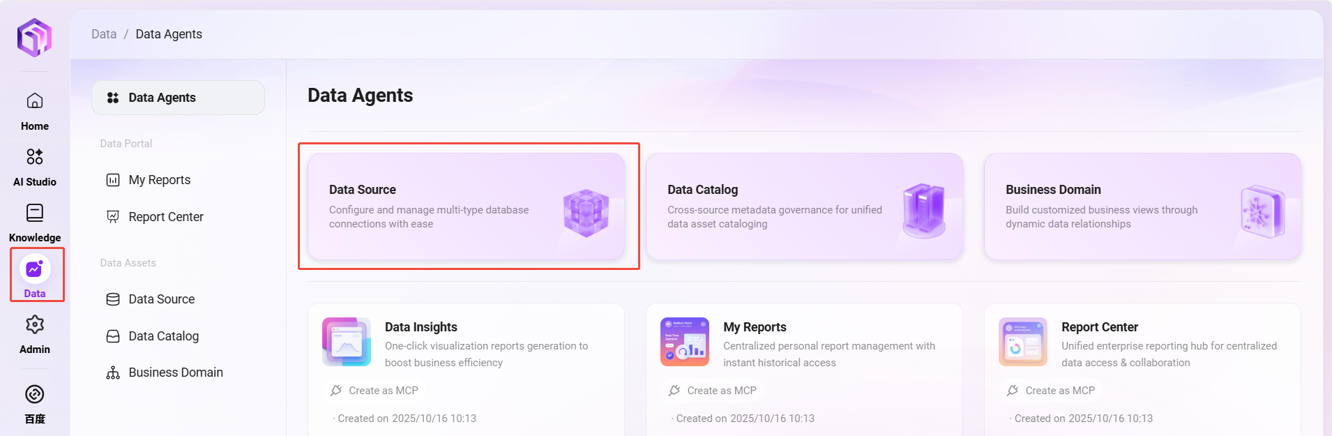 - **「データソース」**を選択し、データソース管理ページに入る。