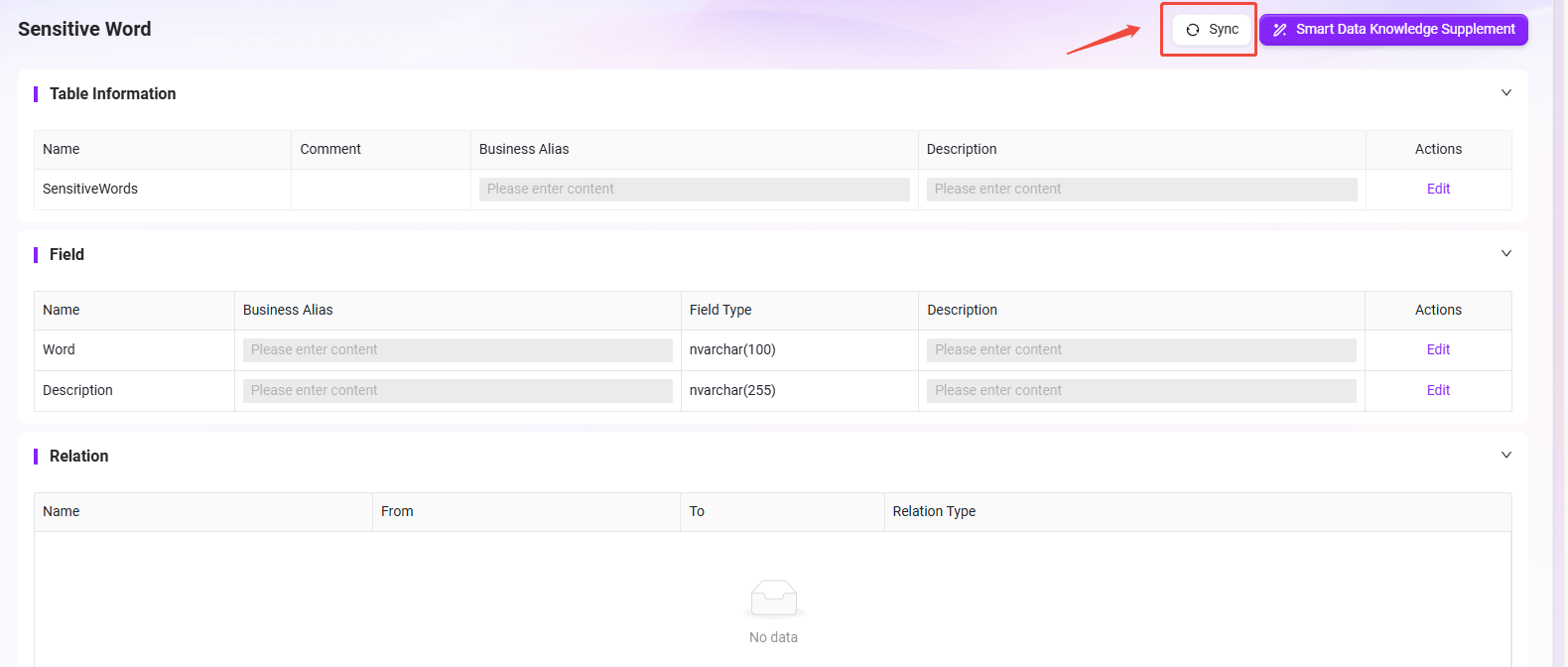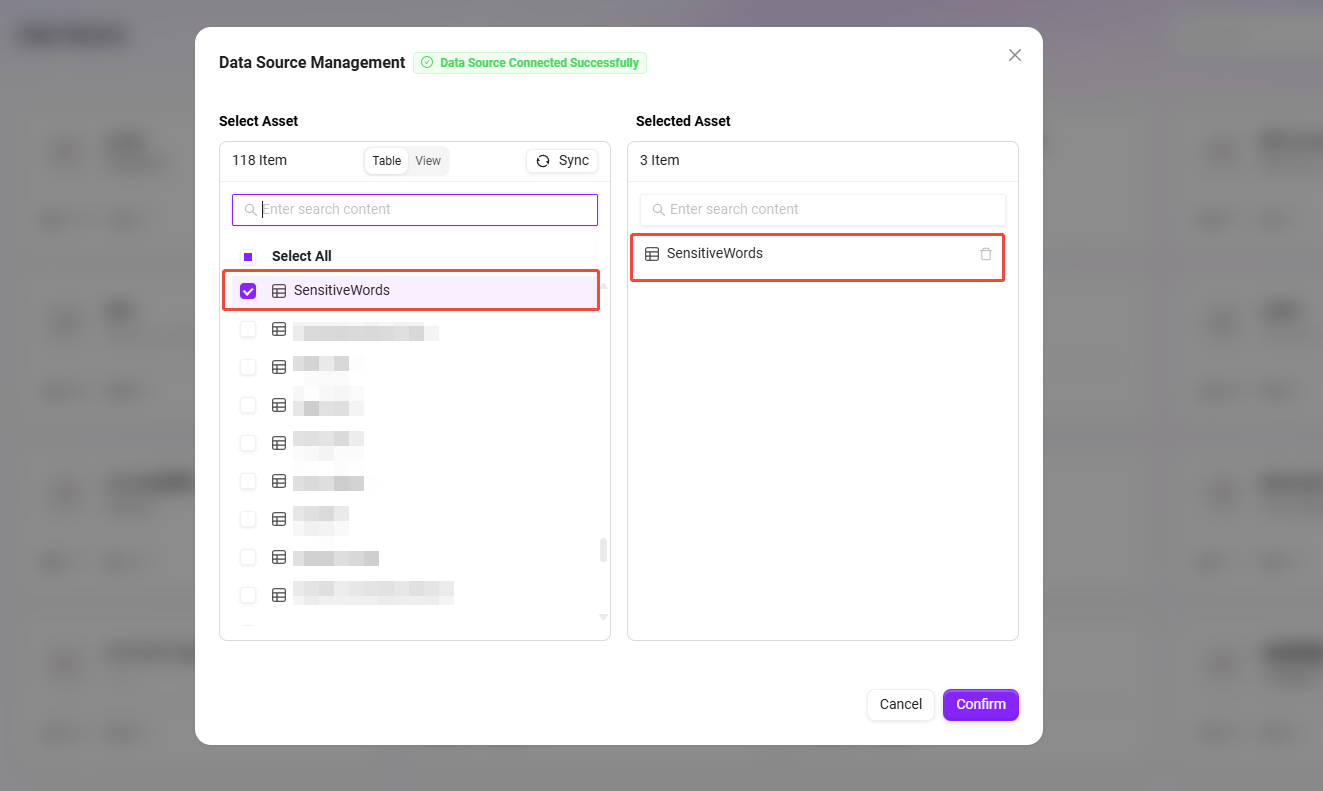 Sensitive Wordデータソースを見つけてクリック。 - **「同期」**操作を実行し、プラットフォームが最新のデータを取得できるようにする。