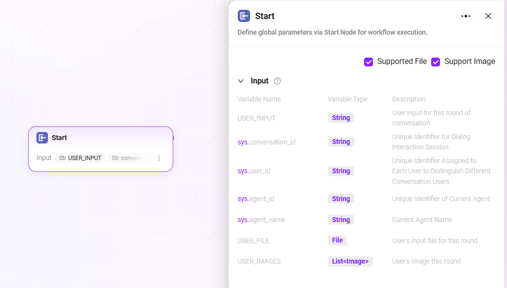 本例のWorkflowでは、各ノードの入出力は前のノードの結果を参照して設定します。センシティブワード抽出の目的を達成するために、本フローは主に開始ノード、ファイル処理ノード、データソースノード、モデルノード、終了ノードを含みます。以下に各ノードの設定と接続方法を順に説明します。