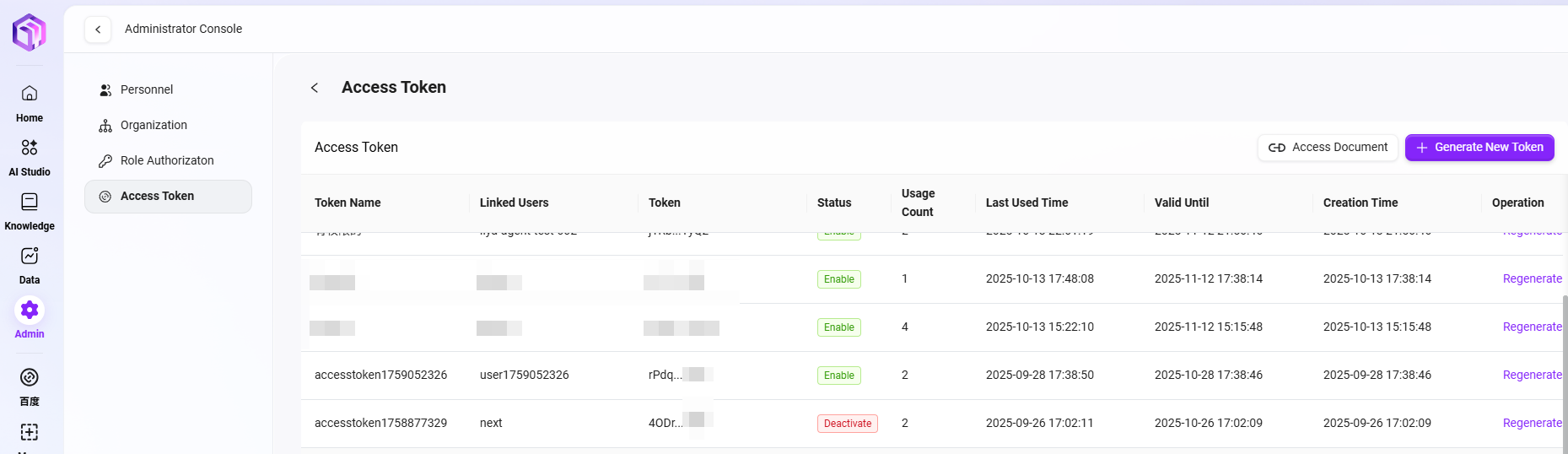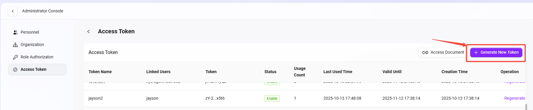 生成されたトークンは即座にリストに表示され、管理者はコピーして後続のAPIアクセスに利用できます。
