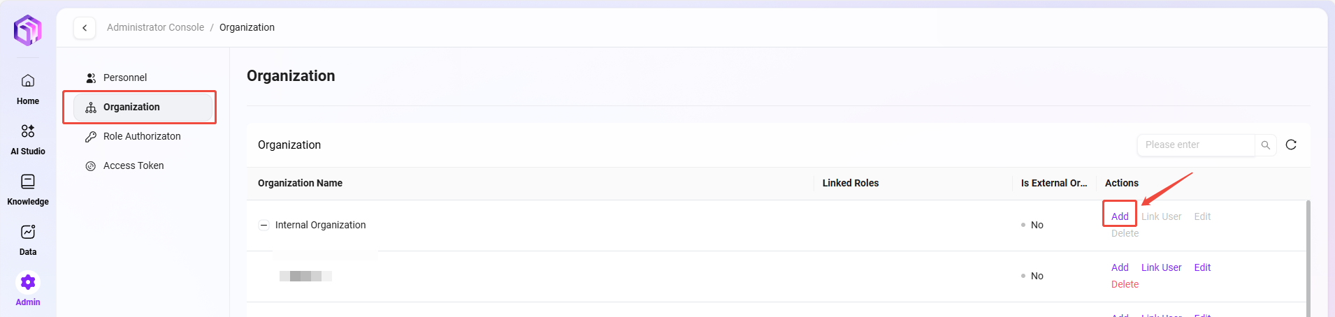 - 作成済みの組織を確認:システムはすべての既存組織情報を表示し、組織名、関連役割、外部組織かどうかなどの情報を含みます。
