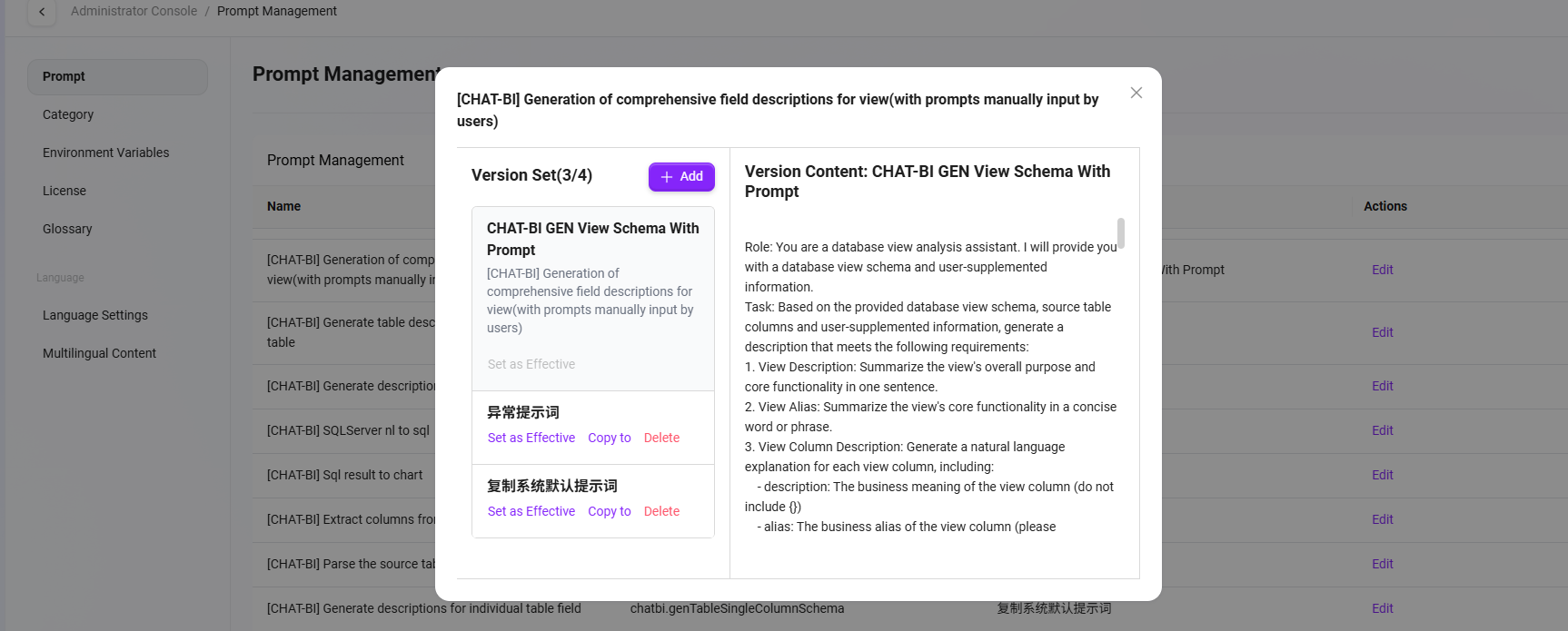 例えば、システム機能点識別子が chatbi.genViewSchemaWithPrompt の場合、このプロンプトはChatBIモジュールでビュー構造を生成する際のシステムプロンプトロジックに使用されます。管理者はこの機能点で複数のバージョン(例:テスト版、正式版)を新規作成し、内容の効果を検証後、手動で1つのバージョンを適用状態に設定し、異なるバージョンのプロンプト適用を柔軟に制御できます。