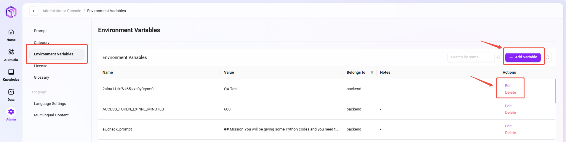 - 「編集」ボタンをクリック:編集ページに入り、環境変数の名称、値、所属モジュールなどを修正可能。