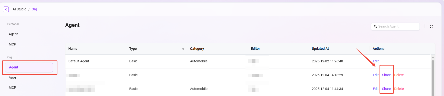 - 管理 -> インテリジェント体管理 -> 組織 -> インテリジェント体 に入り、共有したいアシスタントを見つけます。