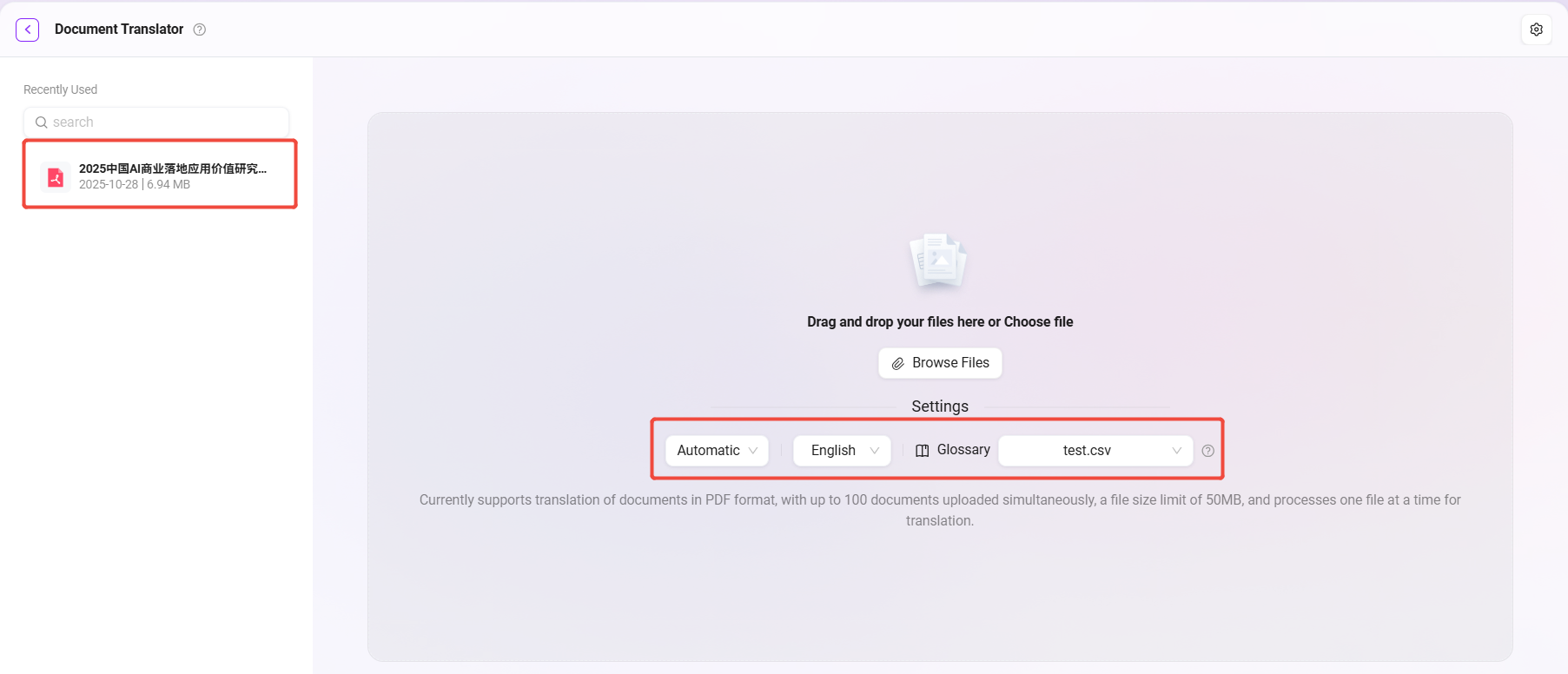 AI Translation はユーザーが迅速に多言語ドキュメント翻訳を完了できるよう支援し、用語集の適用をサポートして専門分野の翻訳精度を高めます。