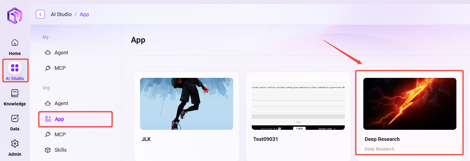- 方法2:AI Studio の APP ページで 「Deep Research」 をクリックしてアプリを開く。