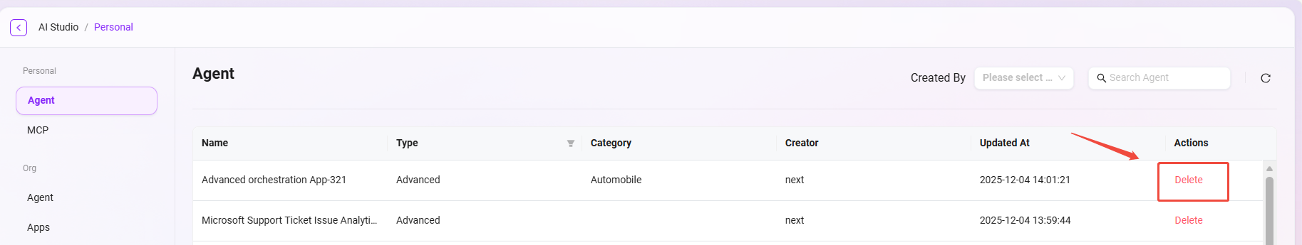 管理者はシステム内で個人エージェントを管理できます。これらのエージェントはユーザーが自身のニーズに応じて作成したAIアシスタントです。エージェント管理を通じて、ユーザーは自身のAIアシスタントリソースを整理、維持、最適化することができます。