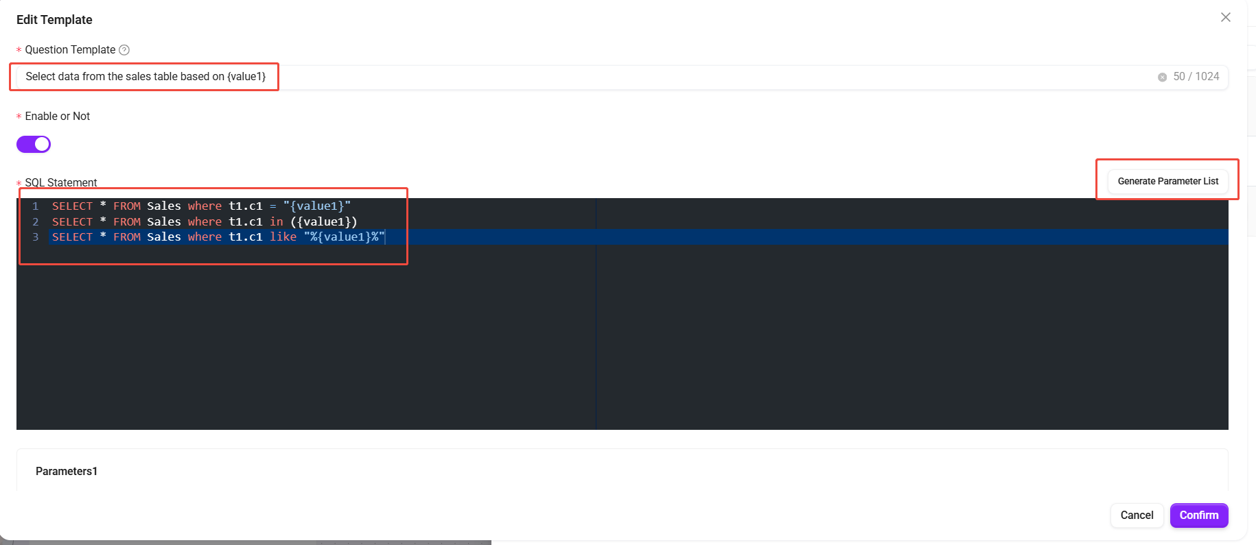 - SQLステートメント入力ボックスの右上にあるパラメータリスト生成をクリックします。システムはSQLからプレースホルダーを自動的に抽出し、各パラメータのプロパティを設定します: