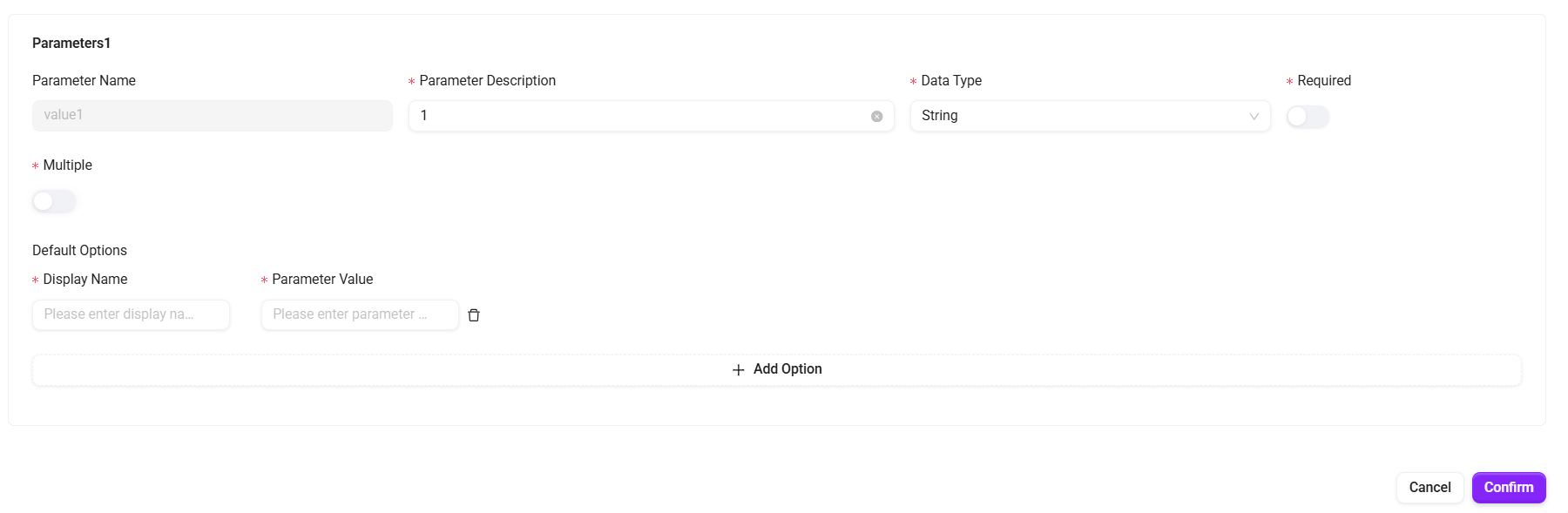 - パラメータ名、文字タイプ、必須かどうか、複数選択をサポートするかどうかを入力します。