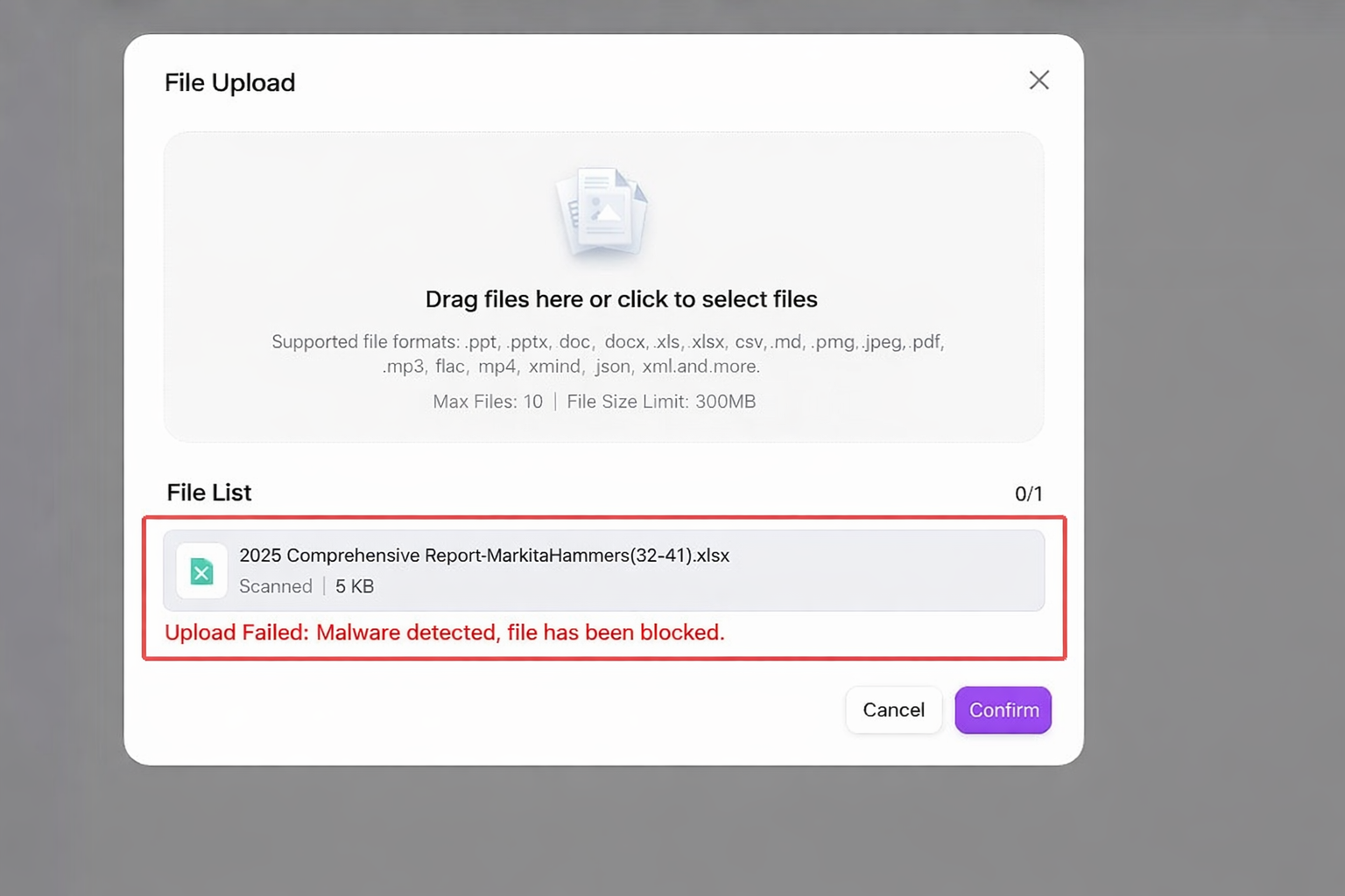 アップロード内容の安全を確保し、悪意のあるファイルのアップロードを防止するため、システムはファイルセキュリティスキャン機能を統合しています。この機能は環境変数で設定する必要があります。